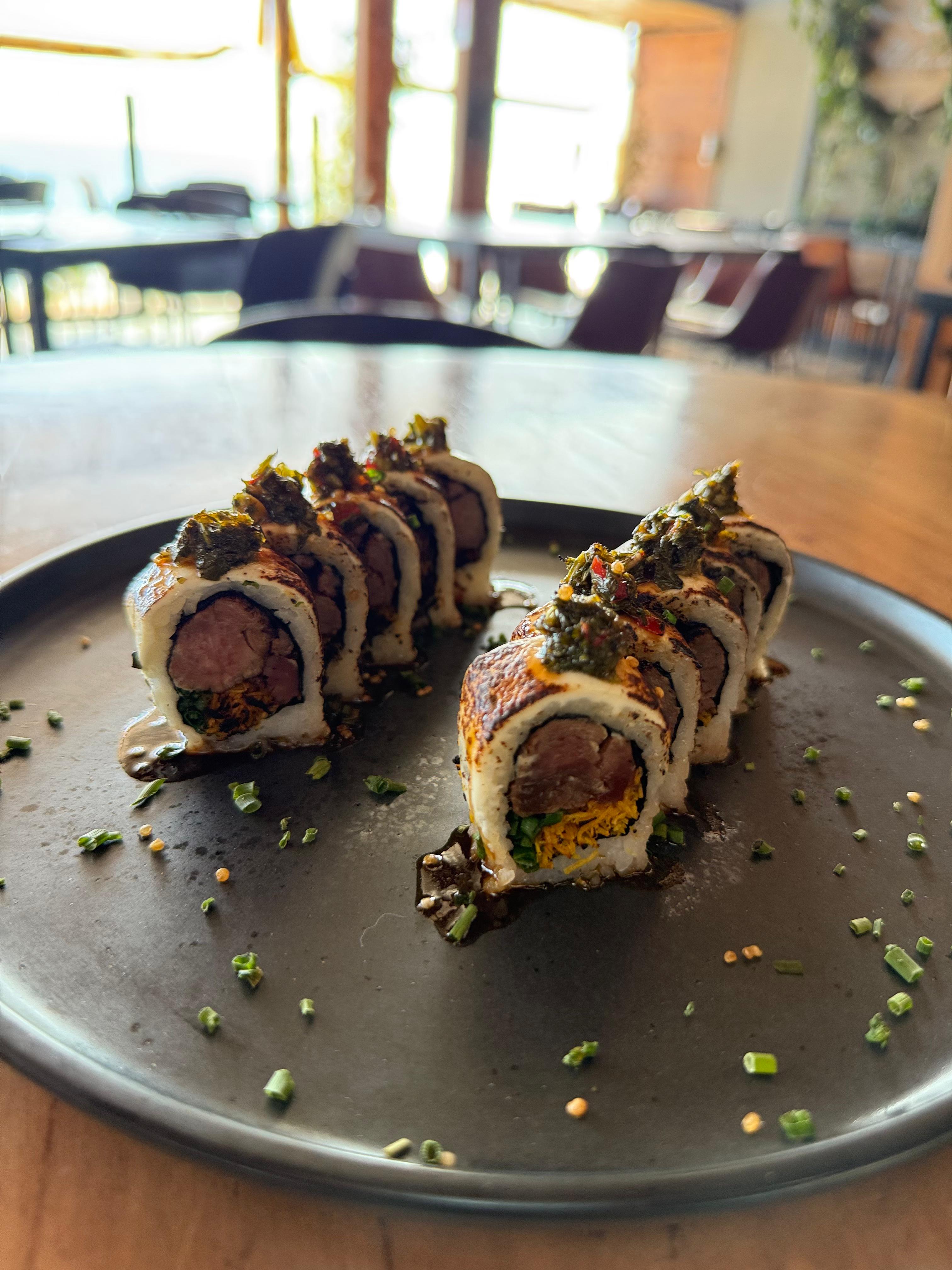 Relleno de palta, cubierto en quinoa crocante y coronado con tartar de filete wagyu flameado con chimichurri nikkei. El toque final: salsa de la casa y ciboulette que elevan cada bocado.